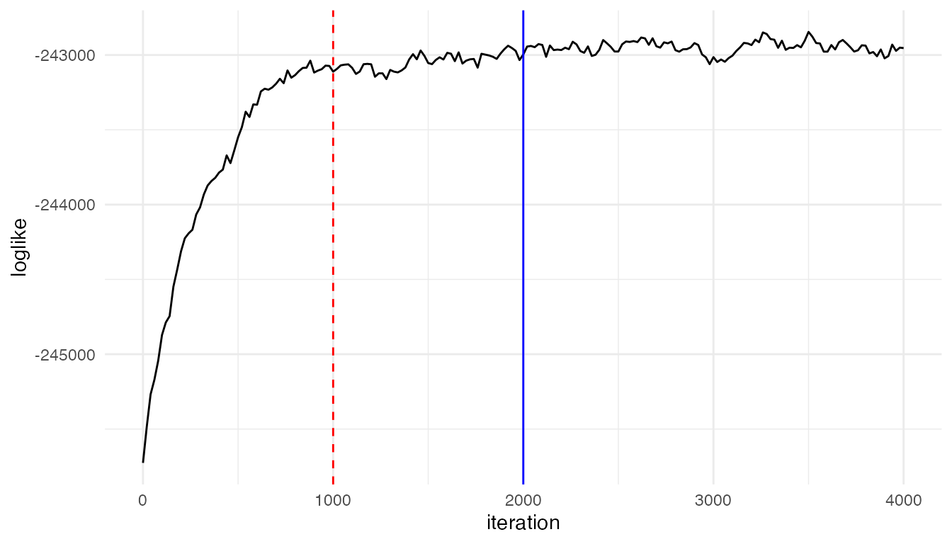 ggplot(trace_result, aes(x = iteration, y = loglike))+ geom_line()+theme_minimal()+geom_vline(xintercept = 1000, linetype = "dashed", color = "red") + geom_vline(xintercept = 2000, color = "blue")
